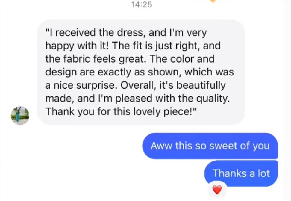I received the dress and I'm very happy with it. The fit is just right and the fabric feels great. The colour and design are exactly as shown, which is a nice surprise...