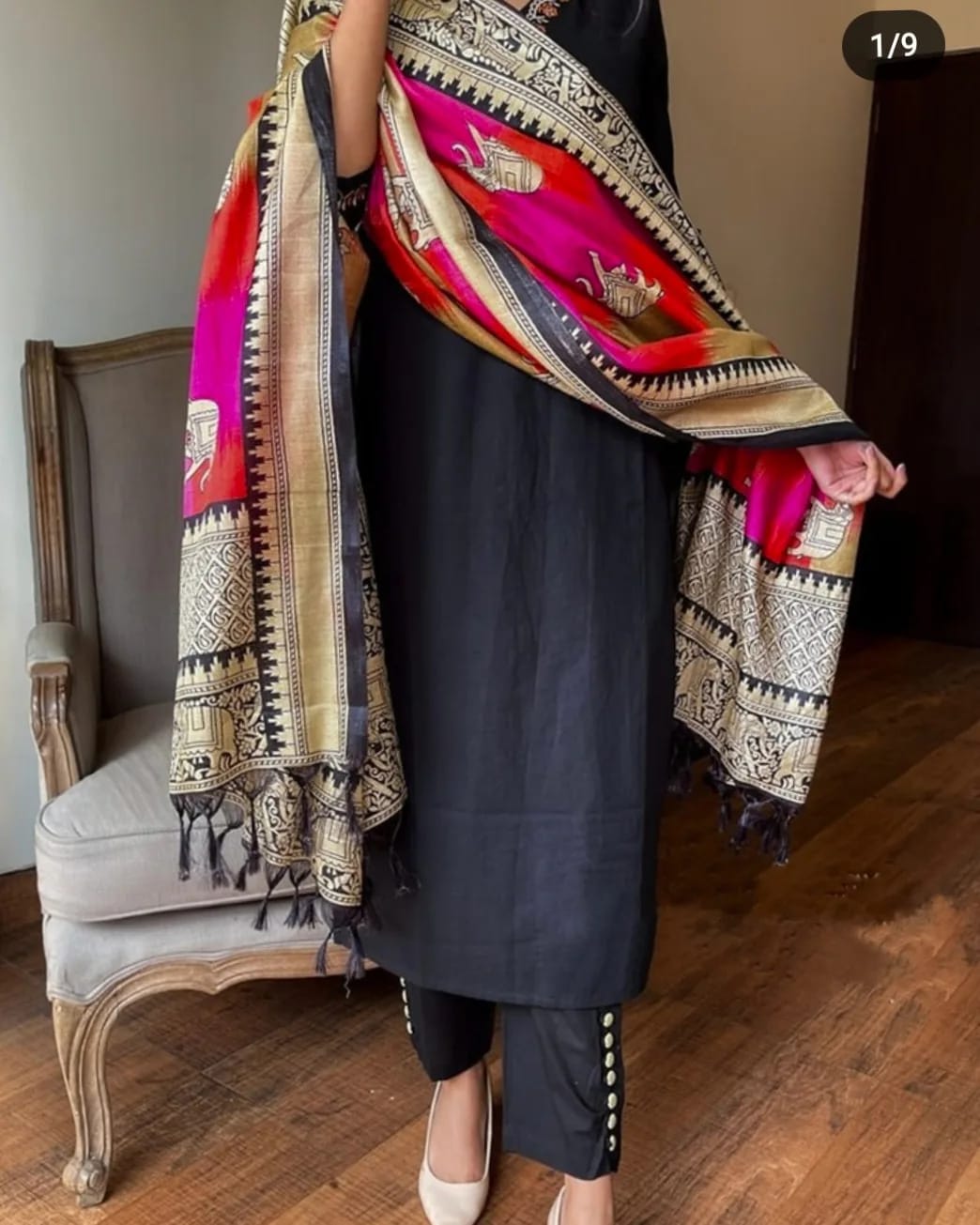 This expertly crafted Black Handloom Cotton Kurta Set with Khadi Silk Dupatta offers both comfort and style. The khadi silk dupatta adds a touch of elegance, while the buttons on the pants provide a sophisticated detail. Made with 100% handloom cotton, this set is perfect for any occasion.