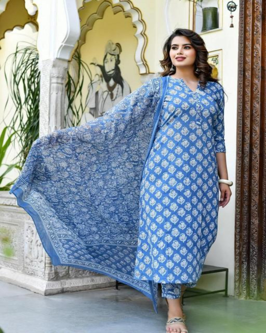 Experience the best of Indian fashion with our Blue Jaipur cotton kurta set. Made from beautiful and classy Sanganer cotton, this traditional outfit is perfect for any occasion. Its stunning block print adds a touch of elegance, making you stand out in a crowd. Upgrade your wardrobe with our expertly crafted kurta set. Paired with Kota doria dupatta.